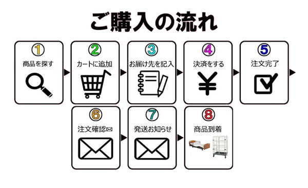 お届け先を記入して、支払いを完了させると「注文確認(自動配信)」がご登録した「携帯電話番号」「メールアドレス」に送信されます。※特に「カゴ台車」「介護ベッド」「車椅子」などの重量商品では、配送先の「連絡用電話番号」を記載しないと、ドライバーさんが配送できませんので、必ずご記載してください。
